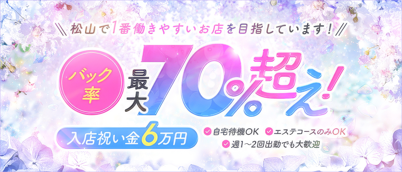 山も島も海もある愛媛県。 快適な気候条件に恵まれた愛媛県は柑橘が日本一なのはご存じの通りですが、全国でもトップクラスの産業が各地に点在しているのでお遊びユーザーが多く、様々な営業形態のお店が揃っています。 人妻系や素人系、ぽっちゃりさんや痴女さんまで求人がありますので、きっと貴女にピッタリなお店が見つかるはずです。 県庁所在地である松山はショッピングにも便利な繁華街。そこから20分程度の場所に、あの有名な道後温泉が!道後温泉本館は日本最古の温泉で「千と千尋の神隠し」のモデルになったことでも有名ですね。 人情味あふれる県民性が特徴なので、出稼ぎ先に選ぶにもピッタリのエリアです