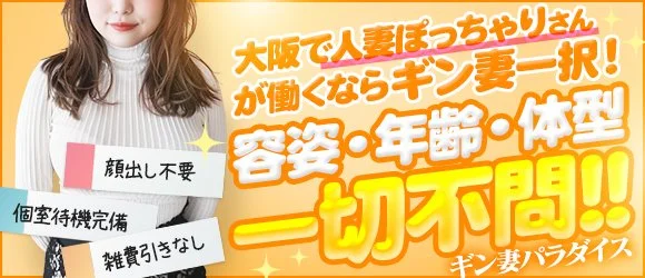 ギン妻パラダイス梅田店は、人妻をコンセプトにしたホテルヘルス店です。兎我野町の中心部に位置しており、グループならではの圧倒的な集客力で、安定してお仕事をご案内できる環境が整っています。